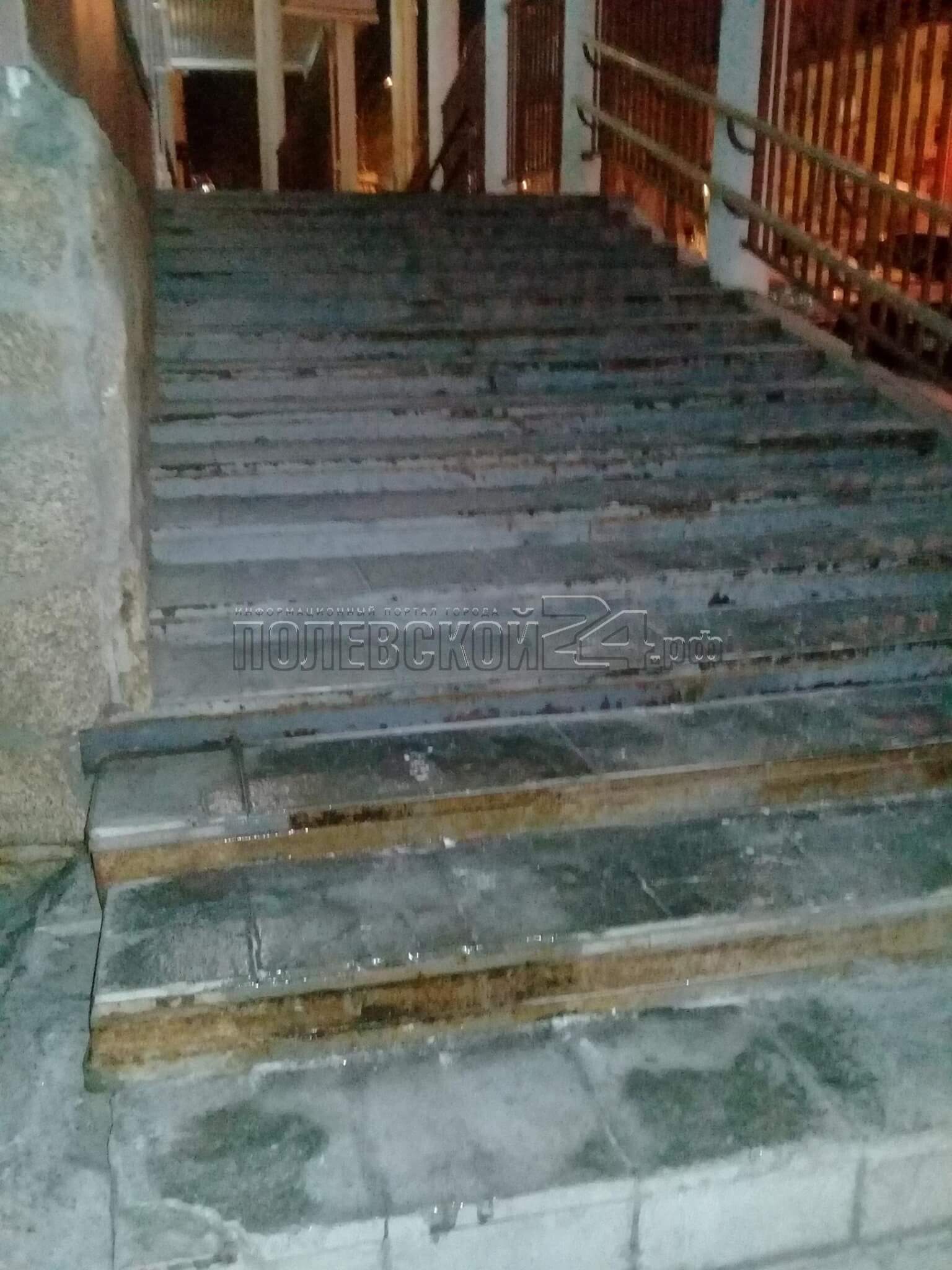 На левом лестничном пролете детской поликлиники четыре нижние ступеньки покрыты льдом и никак не обработаны. Несколько человек уже навернулись здесь с утра пораньше (в темноте льда вообще не видно). Лучше ходите со стороны пандуса.
