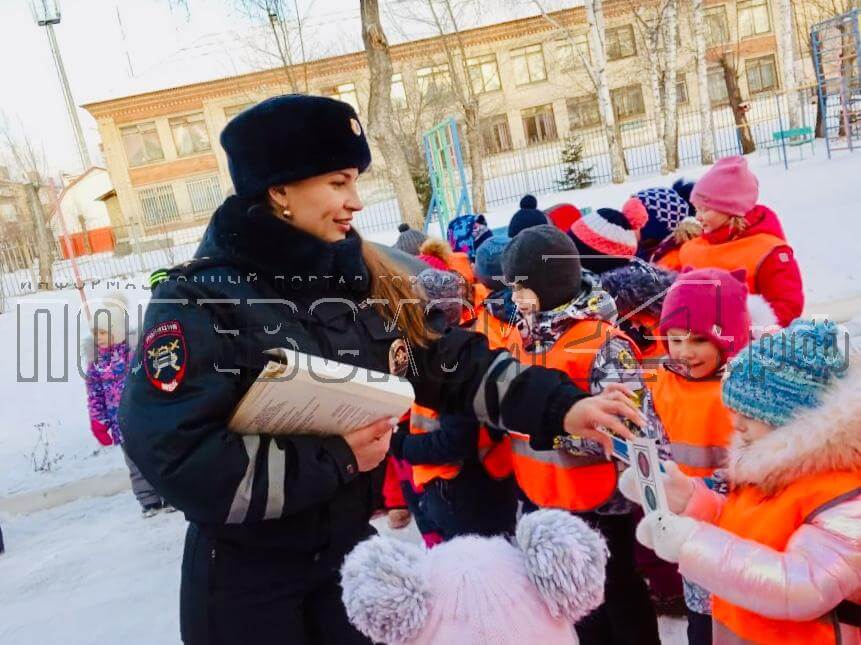 В рамках операции «Горка» для снижение детского дорожно-транспортного травматизма, связанного с игрой на скатах, снежных валах, наледях, которые выходят на проезжую часть или расположены рядом с дорогой сотрудники ГИБДД совместно с инспектором по делам несовершеннолетних напомнили дошколятам детского сада №33 «Жемчужинка» о правилах безопасного поведения на дороге и улице.