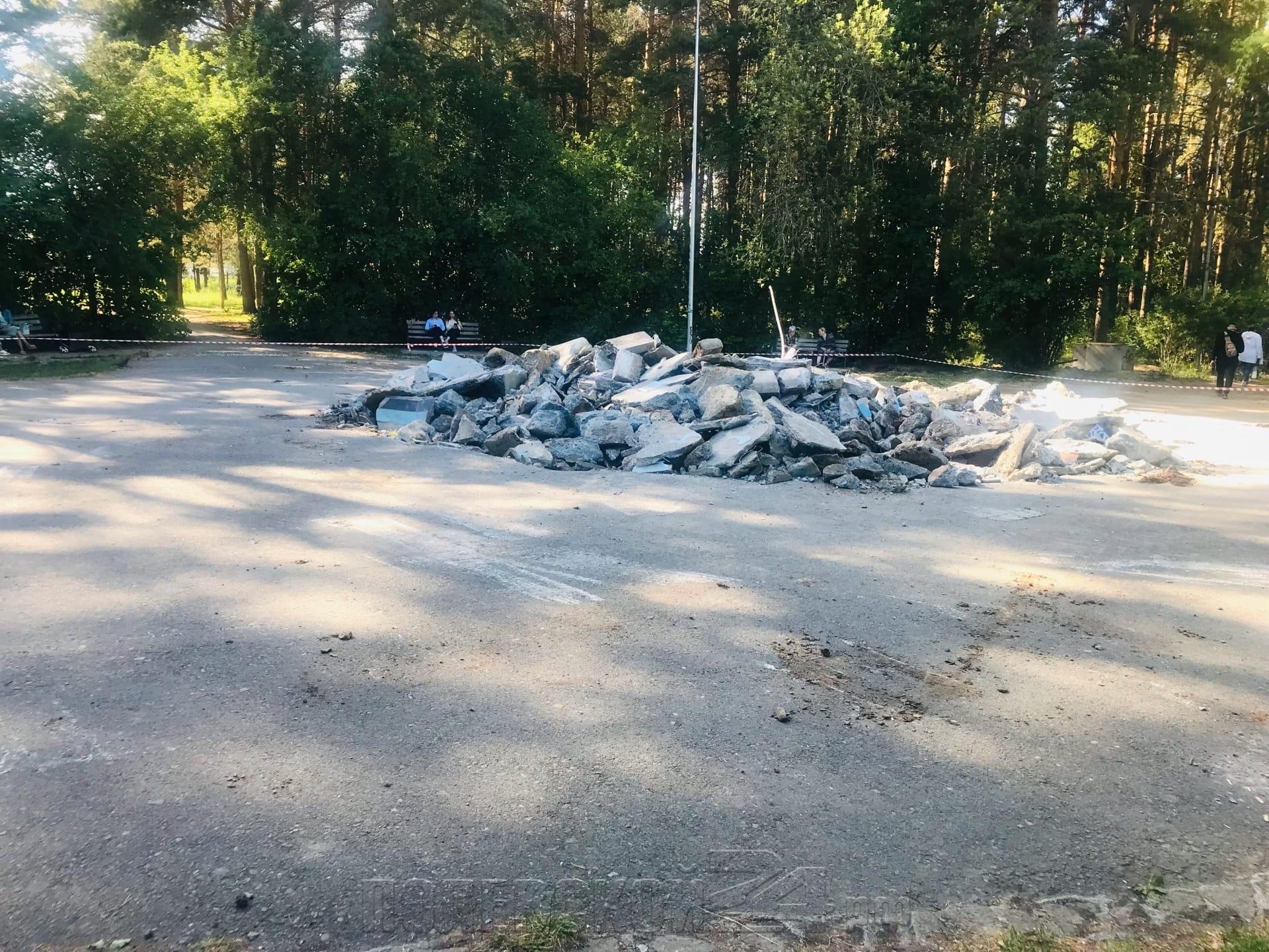В городском парке разрушили фонтан (куча обломков — на верхнем фото). Осталась одна чаша на газоне.