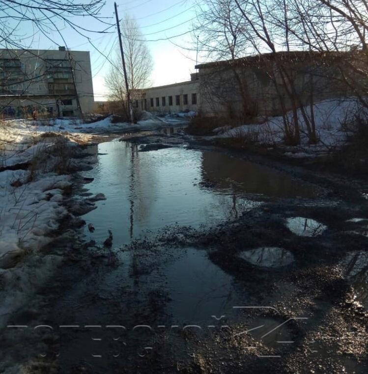 Итак, это район Победы-Ломоносова, въезд в гаражи. Там «подсыпали» уже всем, существующим в природе — от опила до булыжника, но все равно образуется углубление, а где углубление, там и вода. А воды в этот раз много.