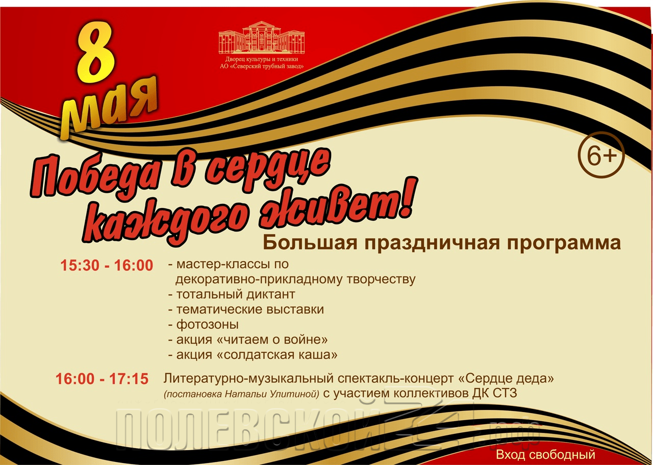 8 мая мы приглашаем вас во Дворец культуры СТЗ на праздничную программу к Дню Победы.