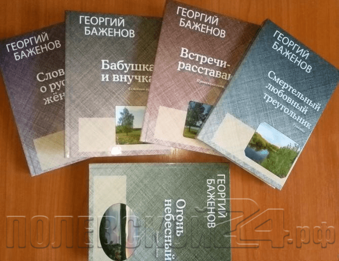 Дорогие полевчане, любители книг! Только что вышли в свет пять книг известного писателя, нашего земляка Георгия Викторовича Баженова. Это «Бабушка и внучка», «Встречи-расставания», «Смертельный любовный треугольник», «Слово о русских жёнах» и «Огонь небесный». Действия баженовских произведений (романов, повестей, новелл, очерков и рассказов с захватывающим сюжетом) происходит в нашем с вами городе.
