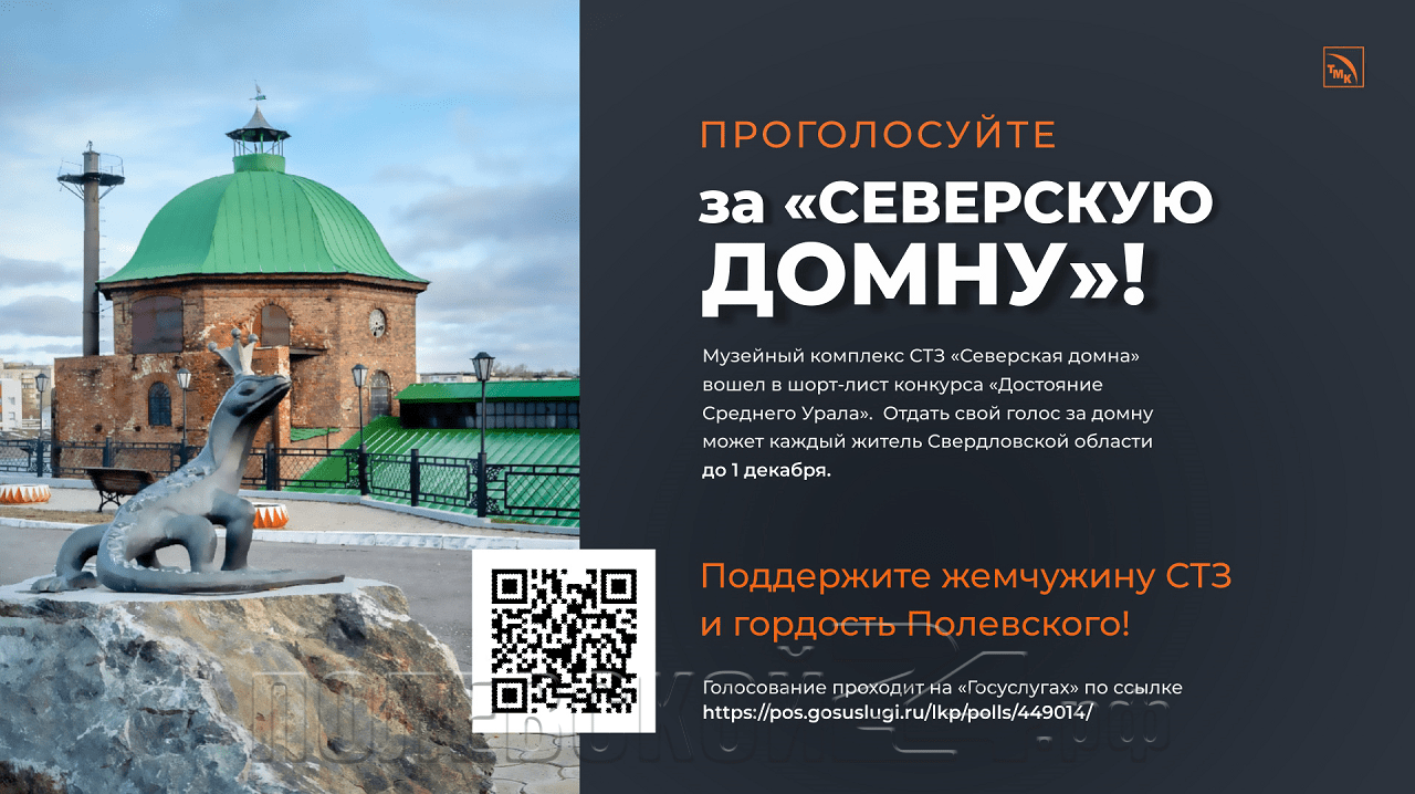 Обращаемся к Вам с просьбой, дорогие земляки, поддержать родной Полевской, родную Северскую домну и проголосовать до 1 декабря 2024 года.