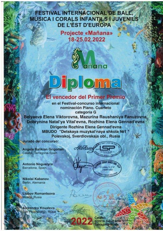 Фортепианные квартеты Музыкальной школы стал лауреатом 1 степени международного конкурса «Маньяна» в испанской Калафели.
