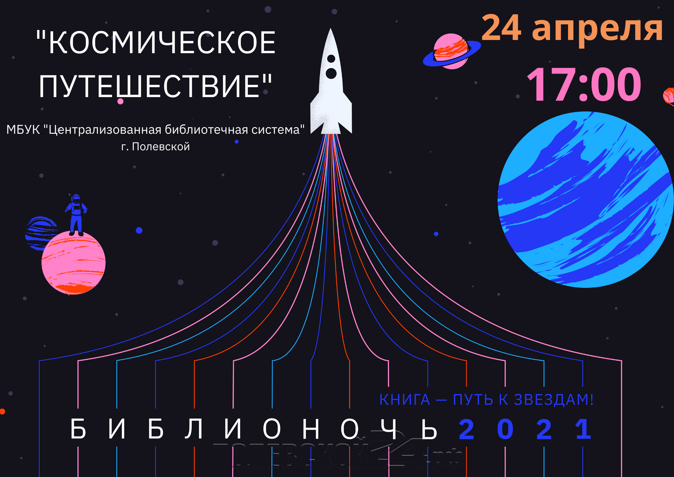 24 апреля 2021 года библиотеки Полевского приглашают жителей и гостей города совершить «Космические приключения», в уже ставшей традиционной, Библионочи.
