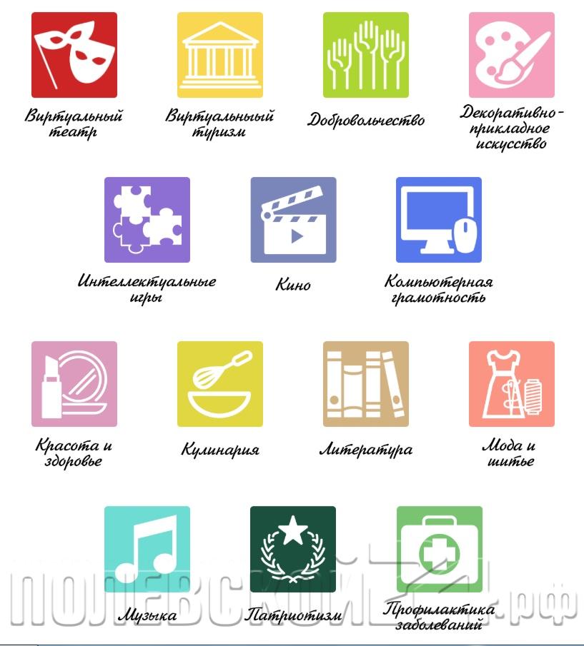 Виртуальный зал представляет собой подборку из 234 ресурсов по более чем 20 направлениям деятельности, среди которых кулинария, декоративно-прикладное искусство, виртуальный туризм, виртуальный театр. Раздел обновляется ежедневно. Контент размещается в форме мастер-классов, видеолекций, прямых трансляций, виртуальных туров и другими способами передачи информации.