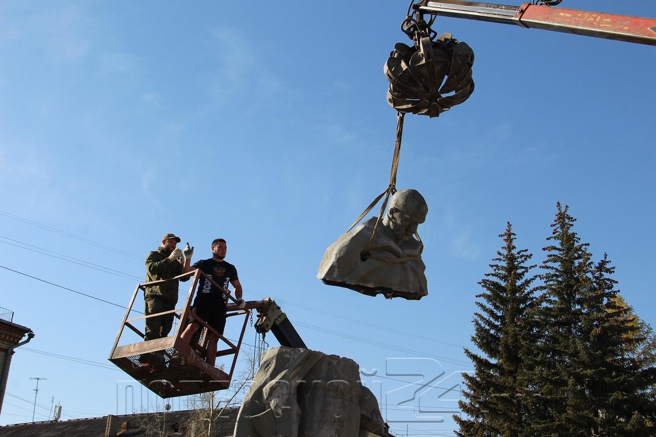 Подрядчики отнеслись к демонтажу со всем уважением и осторожностью. Статую сняли в три приема. Голова и плечи выдержали, аккуратно опустились на землю с помощью крана и в перспективе, после реставрации, могут занять новое место.