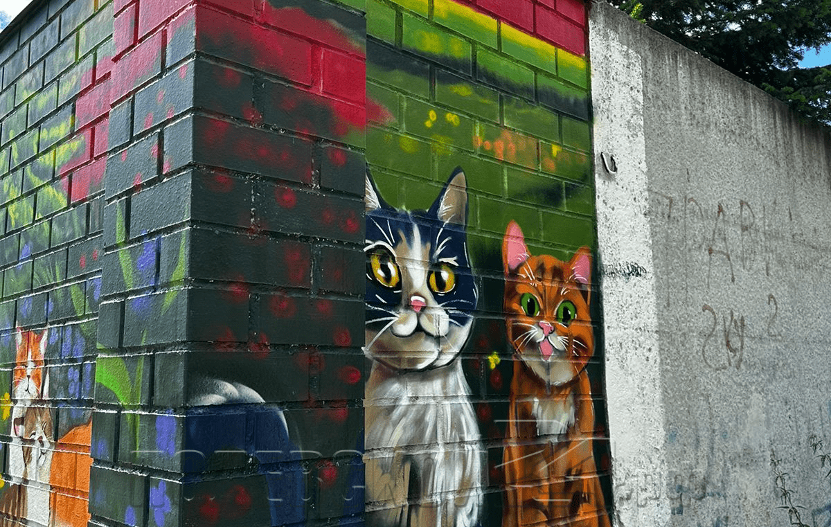 В полевском переулке появился новый мурал. Домовладелец раскрасил забор котами