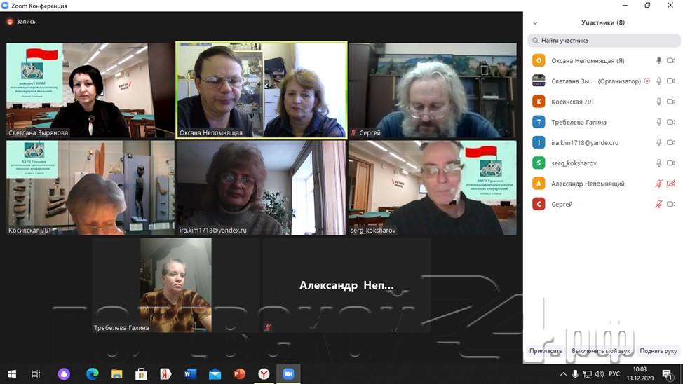 Конференцию провел 12-13 декабря «Уральский федеральный университет» уже в привычном онлайн-формате. На нее собрались юные археологи не только с уральского региона (Челябинск, Курган, Озерск, Полевской, Карабаш, п.Октябрьский), но из Москвы и Ставропольского края. На заседании пяти секций «Каменный век», «Бронзовый и железный век», «Археологический проект», «Дебют», «Историческая археология» заслушали 46 работ. В качестве экспертов выступали д.и.н. С.Ф.Кокшаров, к.и.н. Л.Л.Косинская ., к.и.н. Ю.П.Чемякин, к.и.н. И.С.Огоновская, к.и.н. А.В.Шаманаев, старший преподаватель С.Ю.Зарянова, сотрудник СОКМ Е.Н.Гончарова, сотрудник ИИА Е.Н.Дубовцева, которые не только задавали вопросы докладчикам, но и делали грамотные замечания и предложения о продолжении работы.