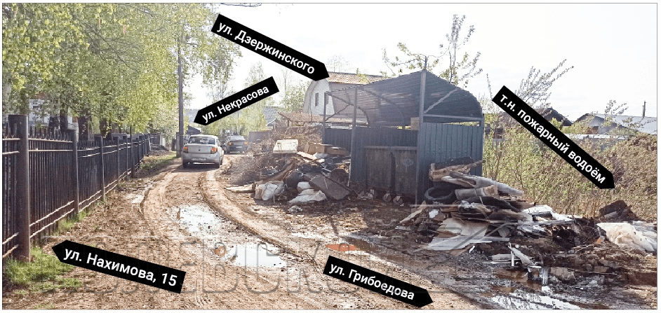 Редакция 15 мая выехала на место, чтобы воочию убедиться в масштабах свалки. Чтобы подойти к контейнерам, нужно шлёпать по лужам. По разбитой грунтовой дороге то и дело проезжают машины – с неё заезжают жители на улицу Дзержинского, так как соседняя улица Некрасова односторонняя. Запах гниения действительно сильно ощутим. Контейнерная площадка, помимо всего прочего, расположена в непосредственной близости от так называемого пожарного водоёма. Словосочетание «так называемого» здесь уместно: сложно представить, как могла бы подъехать пожарная машина к месту, настолько заваленному мусором.