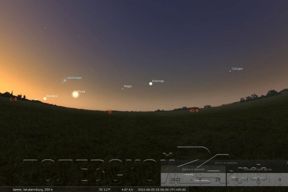 Рано утром 28 августа уральцы смогут наблюдать нечастое астрономическое явление – парад из шести планет и Луны. Марс, Юпитер, Уран, Нептун, Сатурн, Меркурий и естественный спутник Земли (Луна) будут находиться с одной стороны Солнца, выстроившись в неровный ряд примерно на 160 градусах по горизонтали.