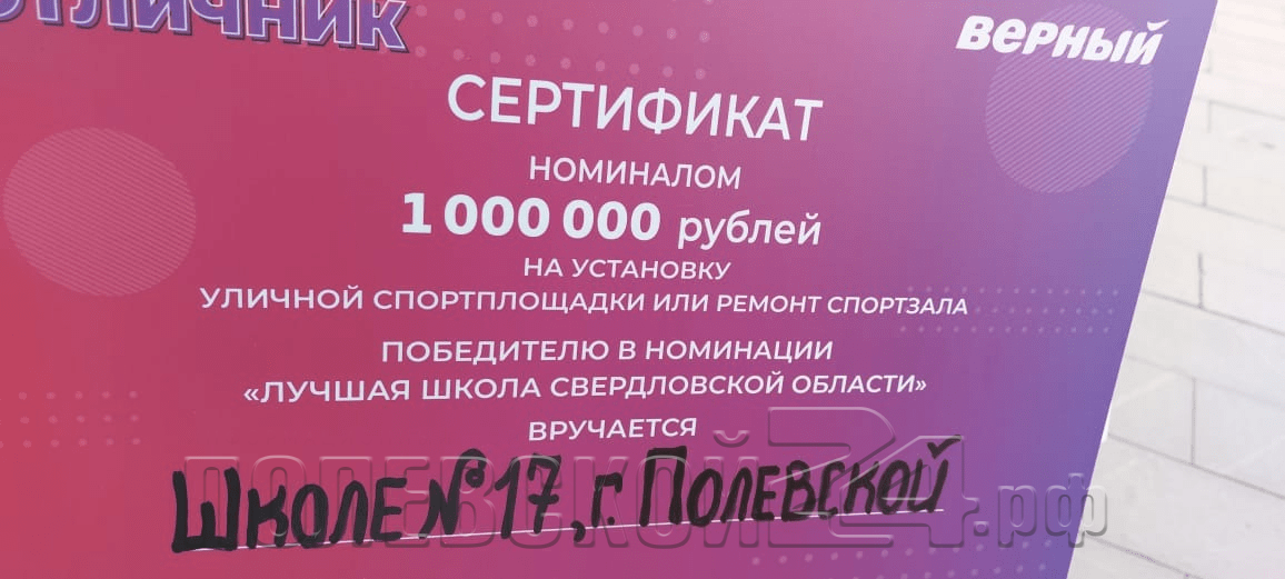 Школа № 17 стала обладателем подарочного сертификата номиналом в 1 000 000 рублей от магазина «Верный». Учебное заведение получило приз в номинации «Лучшая школа Свердловской области», согласно ведомостям об успеваемости учеников за третью четверть.