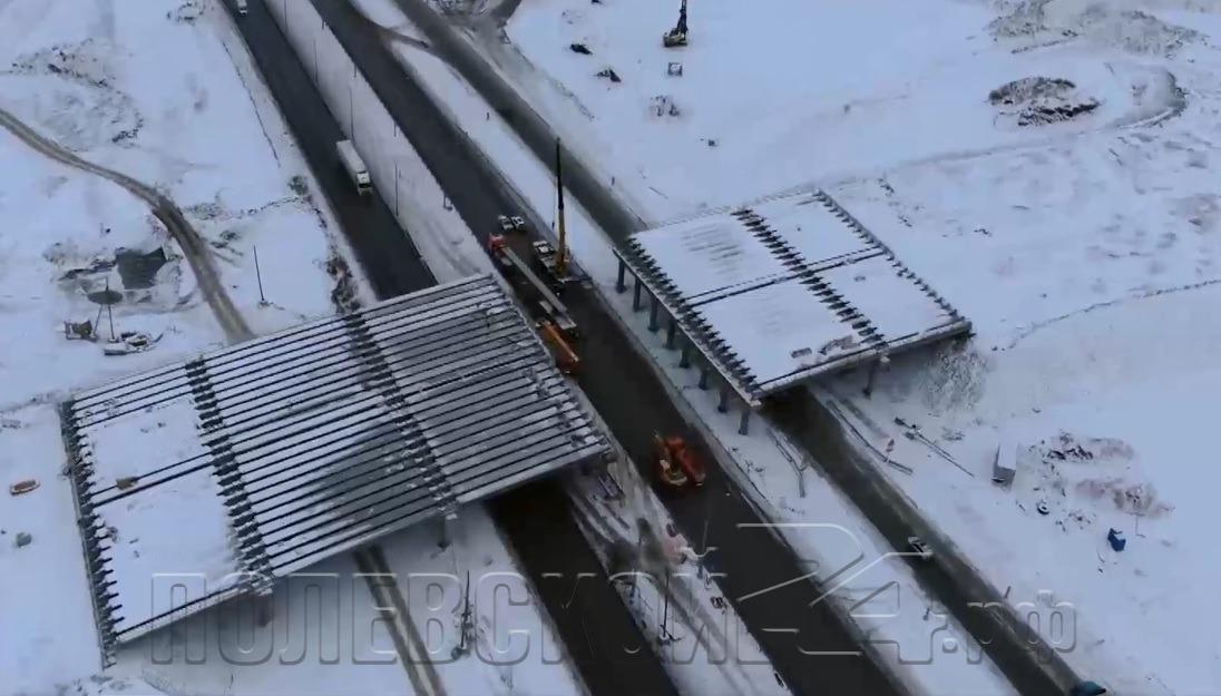 На этом участке развязки шесть пролетов, в каждый нужно установить 24 балки. Одна весит более 30 тонн, чтобы ее поднять – необходимо два крана. Пока минусовые температуры и снег не мешают рабочим, а вот сильный ветер усложняет процесс.
