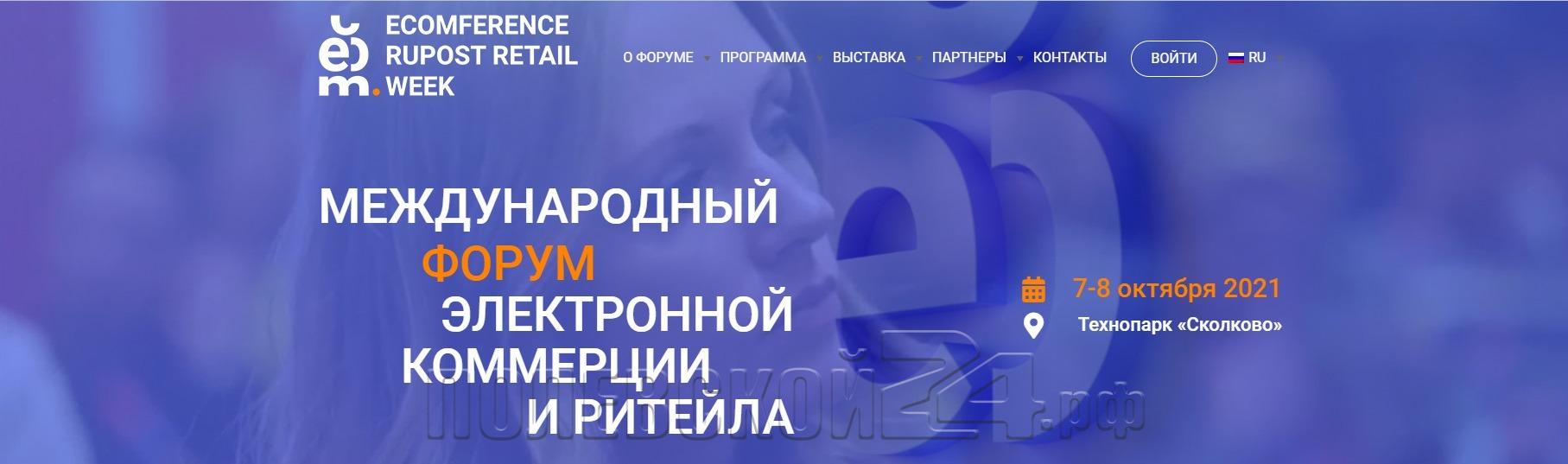 Министерство промышленности и торговли Российской Федерации, совместно с Российской ассоциацией экспертов рынка ритейла с 7 по 8 октября 2021 года в Москве проводят Международный форум электронной коммерции и ритейла «Ecomference Rupost Retail Week» о самых актуальных вопросов и проблем интернет-торговли.