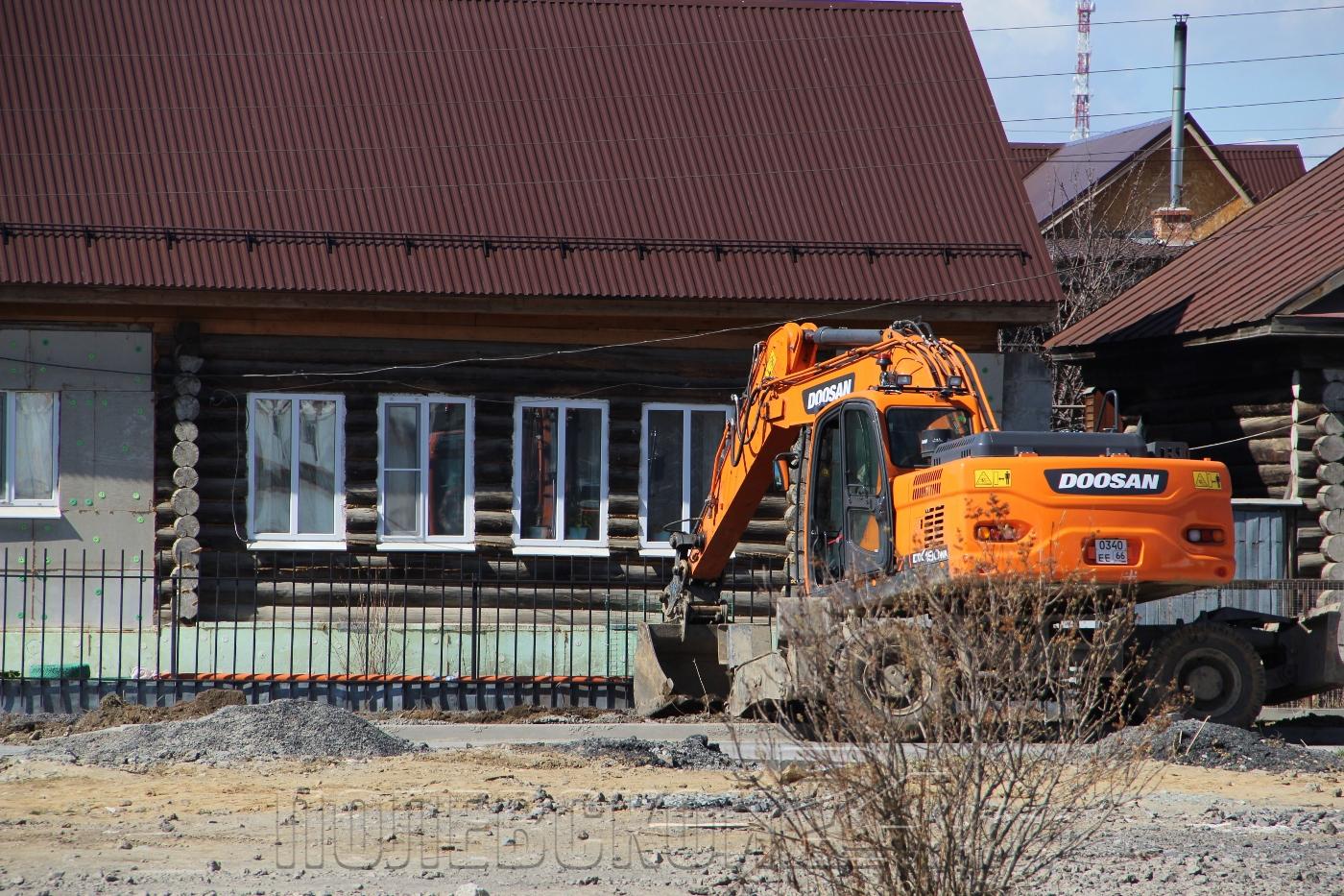На Декабристов вовсю идет строительство тротуаров. Экскаватор ловко выкапывает аккуратный ровик вдоль палисадников.