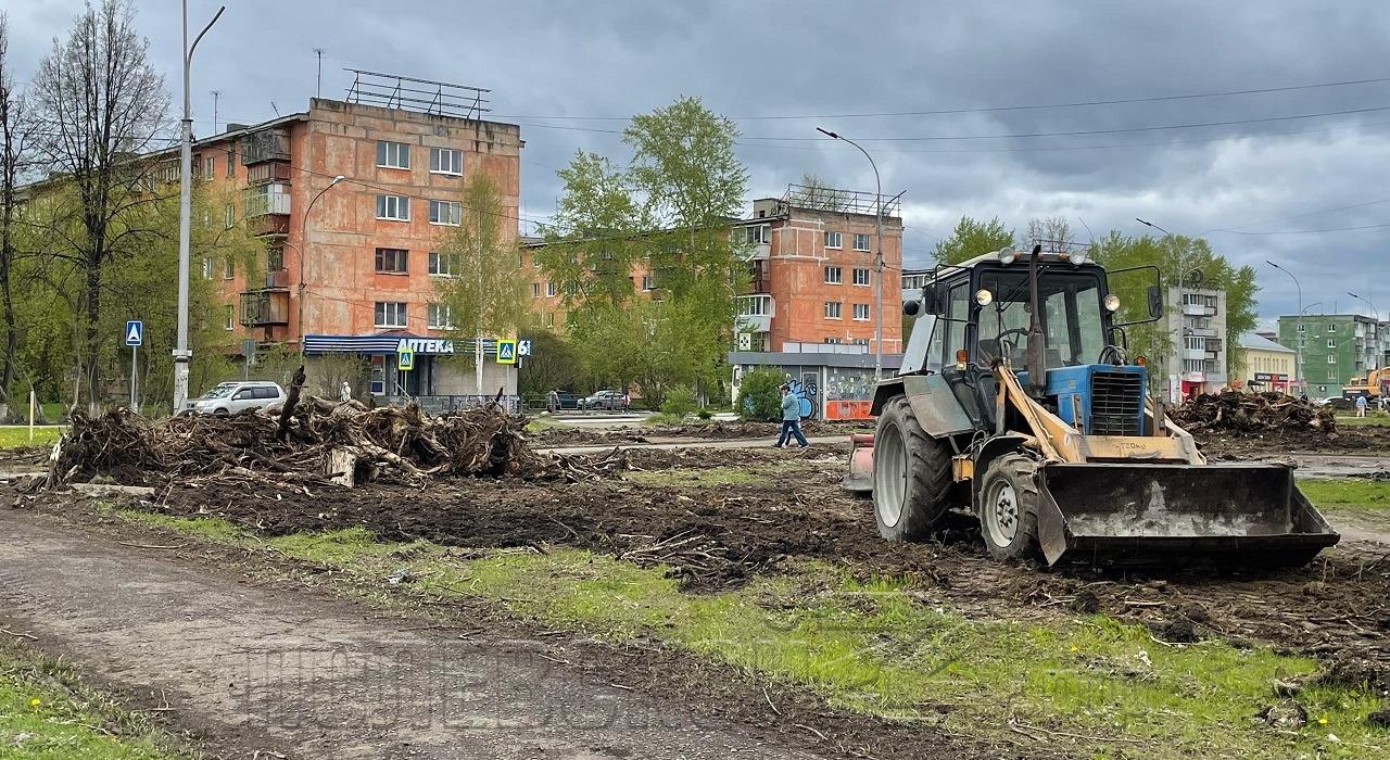 На Коммунистической продолжается ликвидация следов растительности. Сегодня трактор выдирал пеньки.