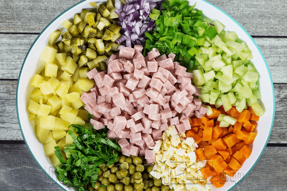 Как уточнили в «Руспродсоюзе», в состав салата вошли картофель (500 г), морковь (200 г), куриные яйца (4 штуки), вареная колбаса (300 г), майонез (200 г) и репчатый лук (100 г), а также зеленый горошек (380 г) и свежие огурцы (400 г). «Ключевой вклад в снижение стоимости главного новогоднего салата внесли овощи», — считают в организации.