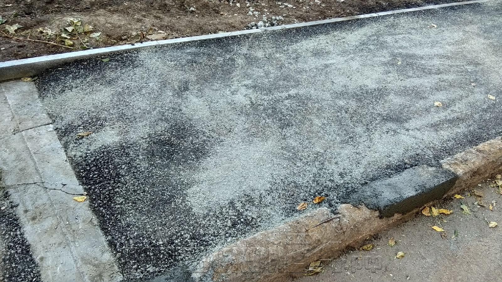 Асфальт уложен отлично, щербатые поребрики восстановлены, внизу, уже возле дома, сделан слив для воды.