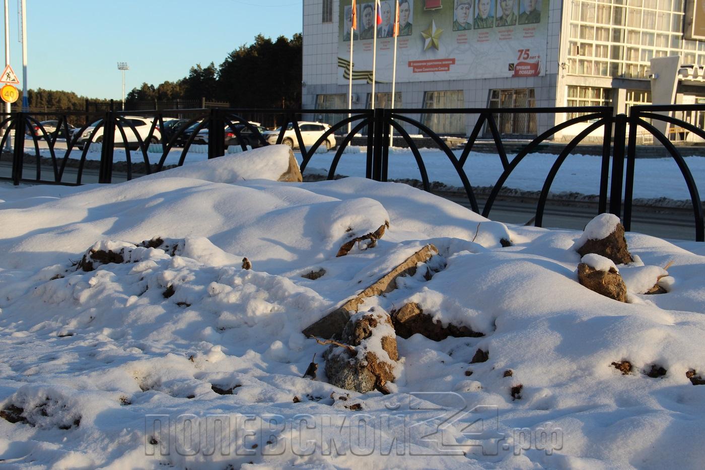 На фото — 19 ноября. Снежный покров сгладил ухабистость и припорошил грязь на тротуаре от дома № 9 на Декабристов до Коммунистической. Но пешеходам ходить здесь действительно неудобно, а строительный мусор – куски асфальта, бортовой камень и даже бетонная труба – так и лежит рядом с дорожкой.
