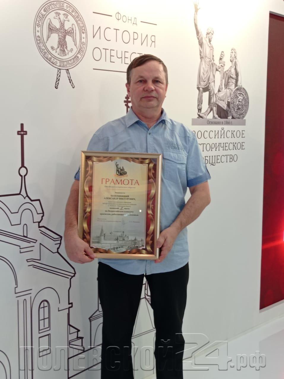 Полевской краевед, историк, археолог и педагог Александр Непомнящий получил диплом за второе место из рук Сергея Нарышкина — председателя Российского исторического общества и директора Службы внешней разведки.
