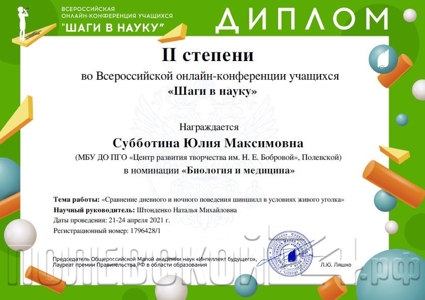 В конце апреля участницы объединения «Юный зоолог» Юлия Субботина и Полина Узлова приняли участие во Всероссийских онлайн-конференциях. Полина в конференции «Открытие» в Ярославле, Юля — в конференции «Шаги в науку» в Москве. Девочки достойно защитили свои работы. Юля получила диплом II степени, Полина — сертификат участника. Поздравляем!