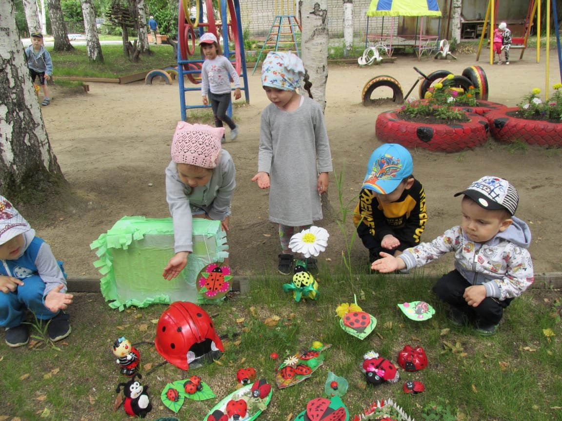 Ребята любовались чудо-жучками — Божьими коровками. В результате мы познакомили ребят с жизнью этих насекомых, какую пользу они приносят. Дети разучили стихи, песенки о Божьей коровке, также лепили и рисовали жучков. Не остались в стороне и родители: они из самых разных материалов (шерсть, фетр, бумага) смастерили волшебных жучков.