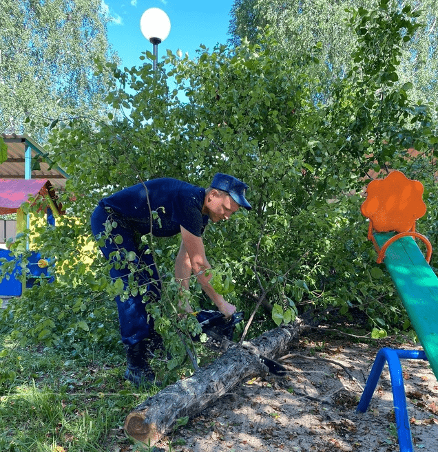 С помощью специальной техники пожарные убрали опасно нависшие ветки и деревья, угрожающие целостности здания этого дошкольного учреждения.