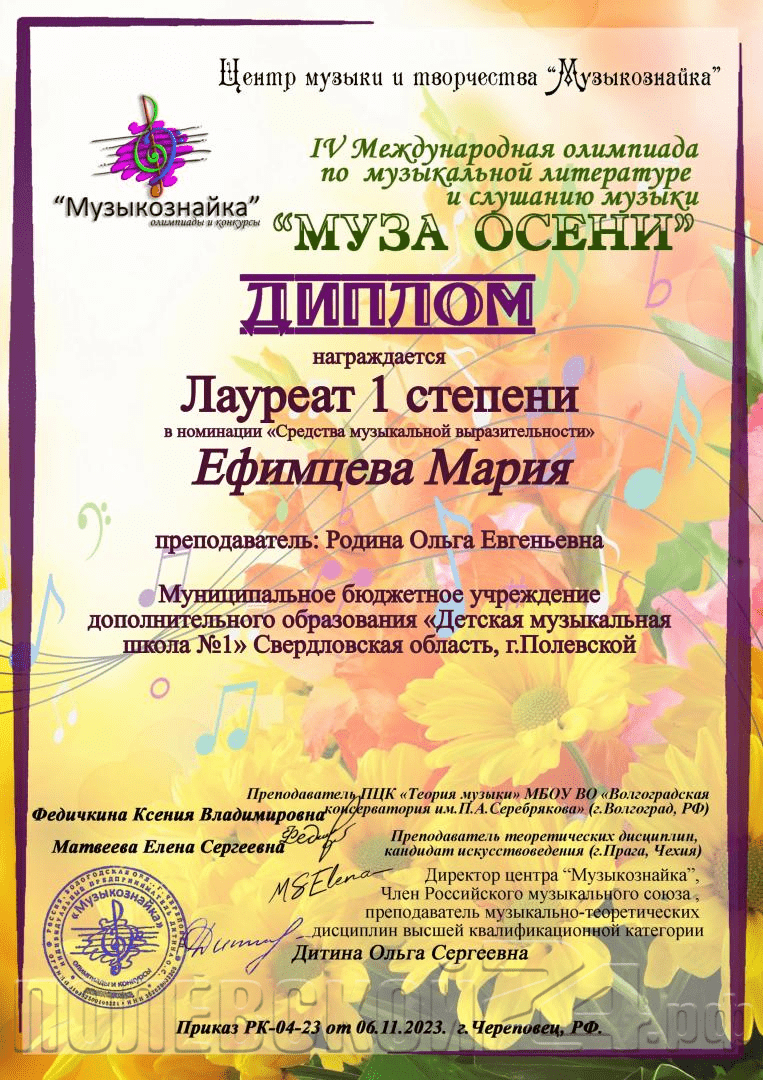 Ученица музыкальной школы Маша Ефимцева стала лауреатом I степени в номинации «Средства музыкальной выразительности» на IV Международной олимпиаде «Муза осени» (по предметам «музыкальная литература» и «слушание музыки»).
