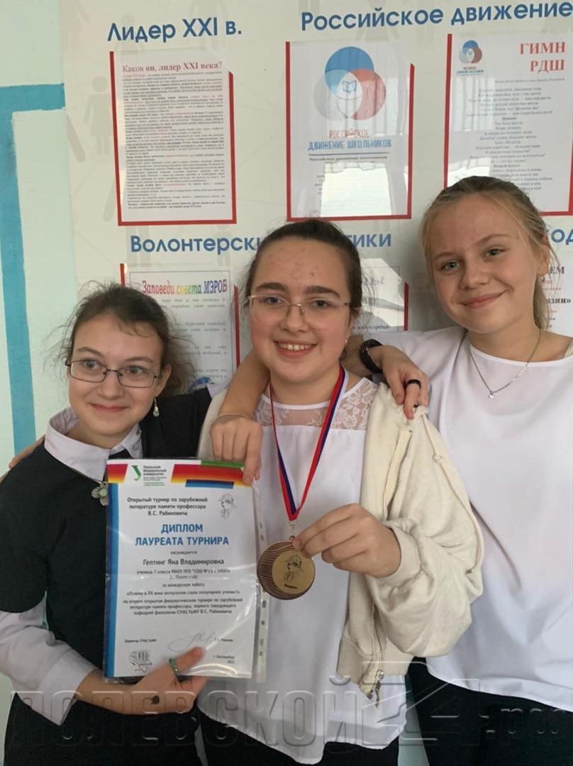 Яна Гептинг (на фото с медалью), ученица 7л школы №13, стала лауреатом Второго открытого филологическом турнире по зарубежной литературе памяти профессора, первого заведующего кафедрой филологии СУНЦ УрФУ В. С. Рабиновича.