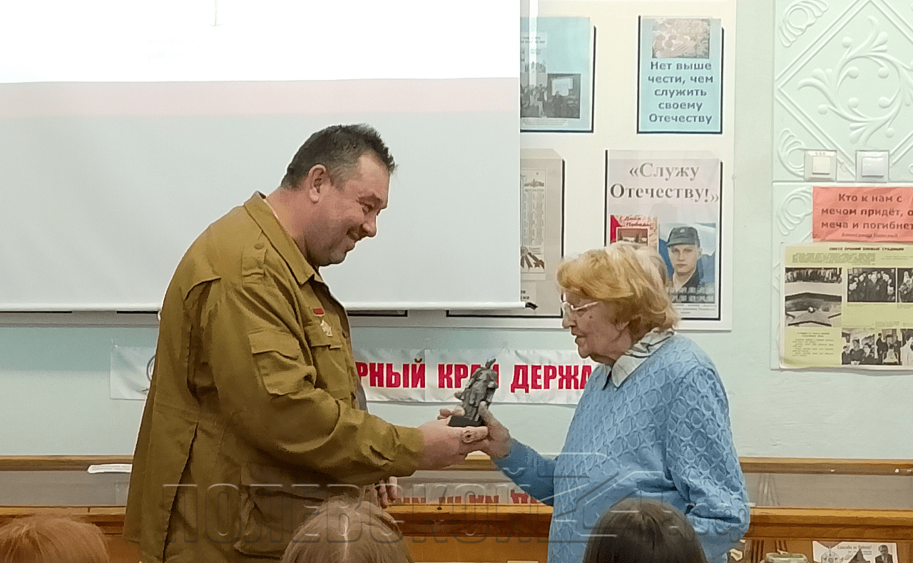 В знак благодарности за организацию Урока Мужества, гости вручили благодарственные письма и памятный подарок – миниатюрную копию памятника Солдату – руководителю школьного музея Тамаре Брагиной и заместителю директора Ирине Литвиновой. Также гости получили поздравления с Днём защитника Отечества!