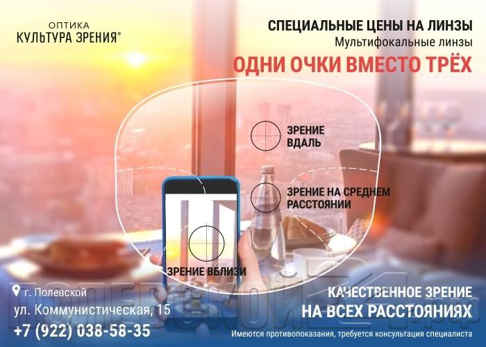 Если вы чувствуете, что пора проверить зрение — есть жалобы на дискомфорт в глазах, стали хуже видеть или хотите планово удостовериться в здоровье глаз, то самое время обратиться в сеть салонов «Культура зрения». Там на современном оборудовании наши специалисты определят, какие линзы вам необходимы, консультанты сети оптик помогут вам подобрать оправу и ответят на интересующие вопросы. В этом месяце специально для вас действует специальное предложение — скидки до 5000 на прогрессивные линзы.