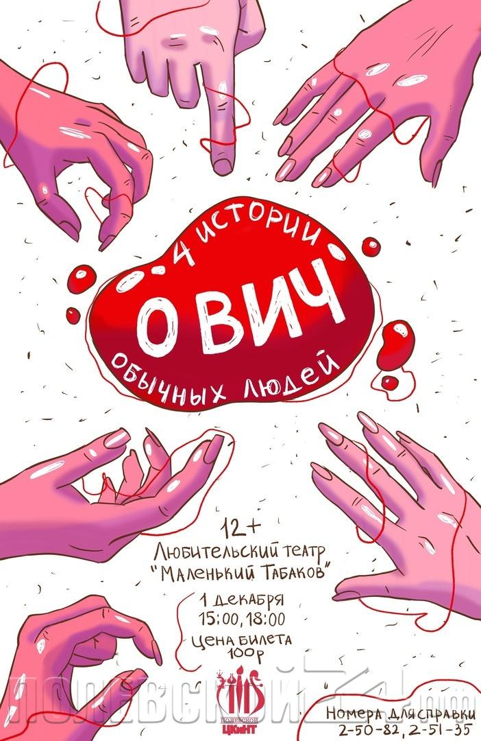1 декабря в Международный день борьбы со СПИДом с 14:00 до 20:00 в ЦКиНТ ( Победы 7) состоится экспресс тестирование на ВИЧ инфекцию перед и во время спектакля «4 истории обычных людей о ВИЧ» — бесплатно анонимно с подарками.