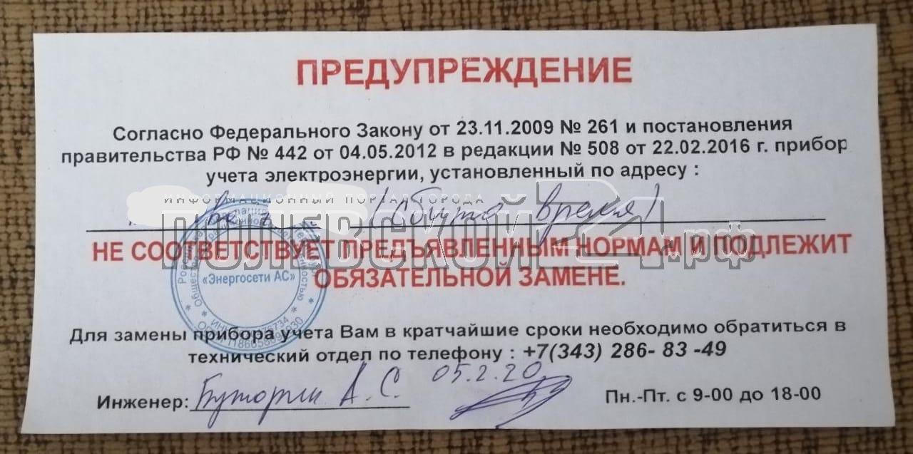 На подложке или фото предупреждения: «Согласно Федерального Закону от 23.11.2009 № 261 и постановления правительства РФ 442 от 04.05.2012 в редакции № 508 от 22.02.2016 г. прибор учёта электроэнергии, установленный по адресу (указан адрес) НЕ СООТВЕТСТВУЕТ ПРЕДЪЯВЛЕННЫМ НОРМАМ И ПОДЛЕЖДИТ ОБЯЗАТЕЛЬНОЙ ЗАМЕНЕ. Причина – сбой времени. Для замены прибора учёта Вам в кратчайшие сроки необходимо обратиться в технический отдел по телефону: +7 (343) 286- 83- 49. Инженер Буторин А.С.»