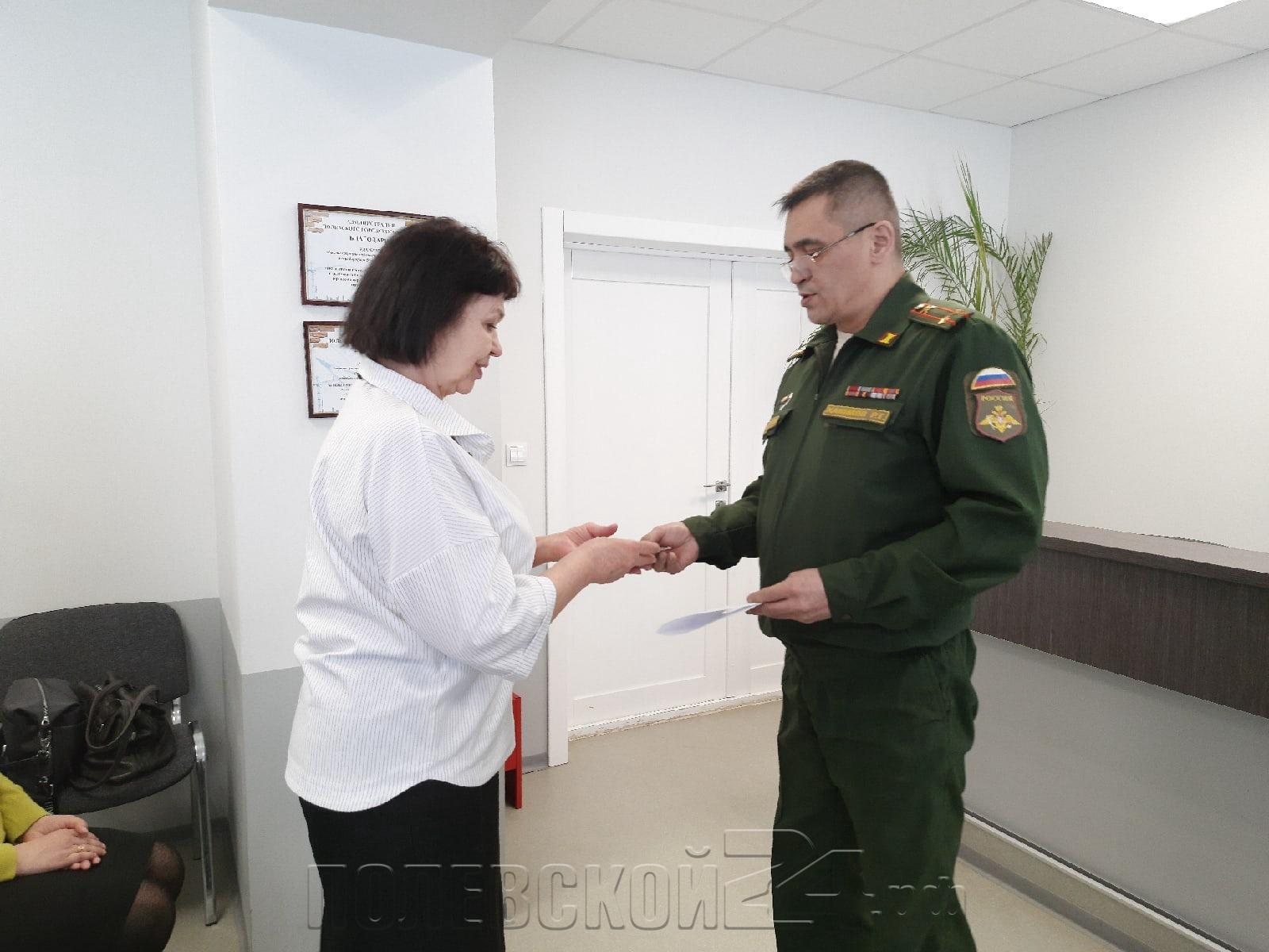 Сегодня в Полевском в зале администрации округа военком торжественно вручил родственникам удостоверение к медали «Зи отвагу», которой был награжден связист сержант Тыщенко еще в 1944 году. Документы получила его дочь Вера Гречко.