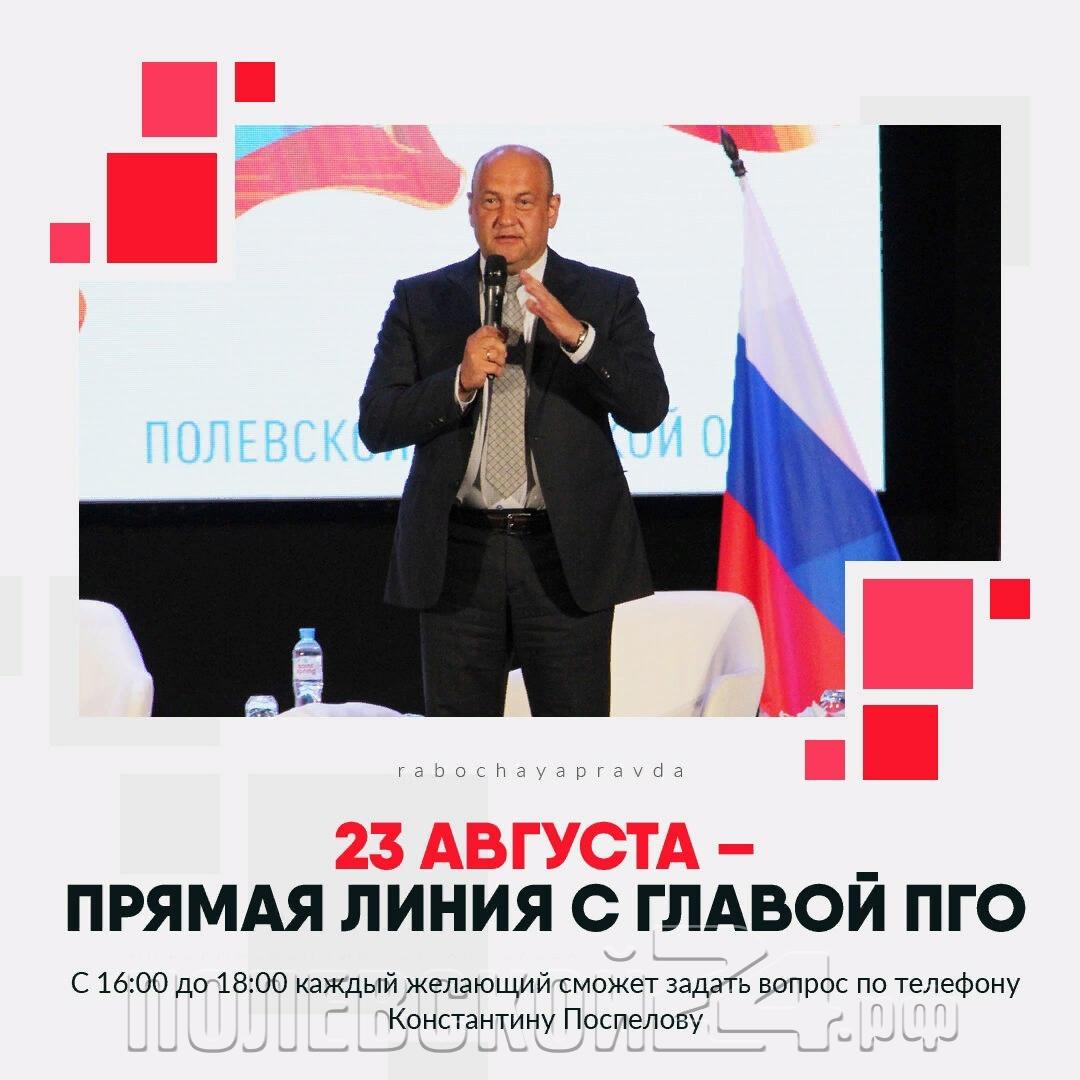 23 августа с 16:00 до 18:00 вы можете позвонить по номеру телефона 8-902-274-73-32 (оператор «Теле2») и задать вопрос главе Полевского Константину Сергеевичу Поспелову.