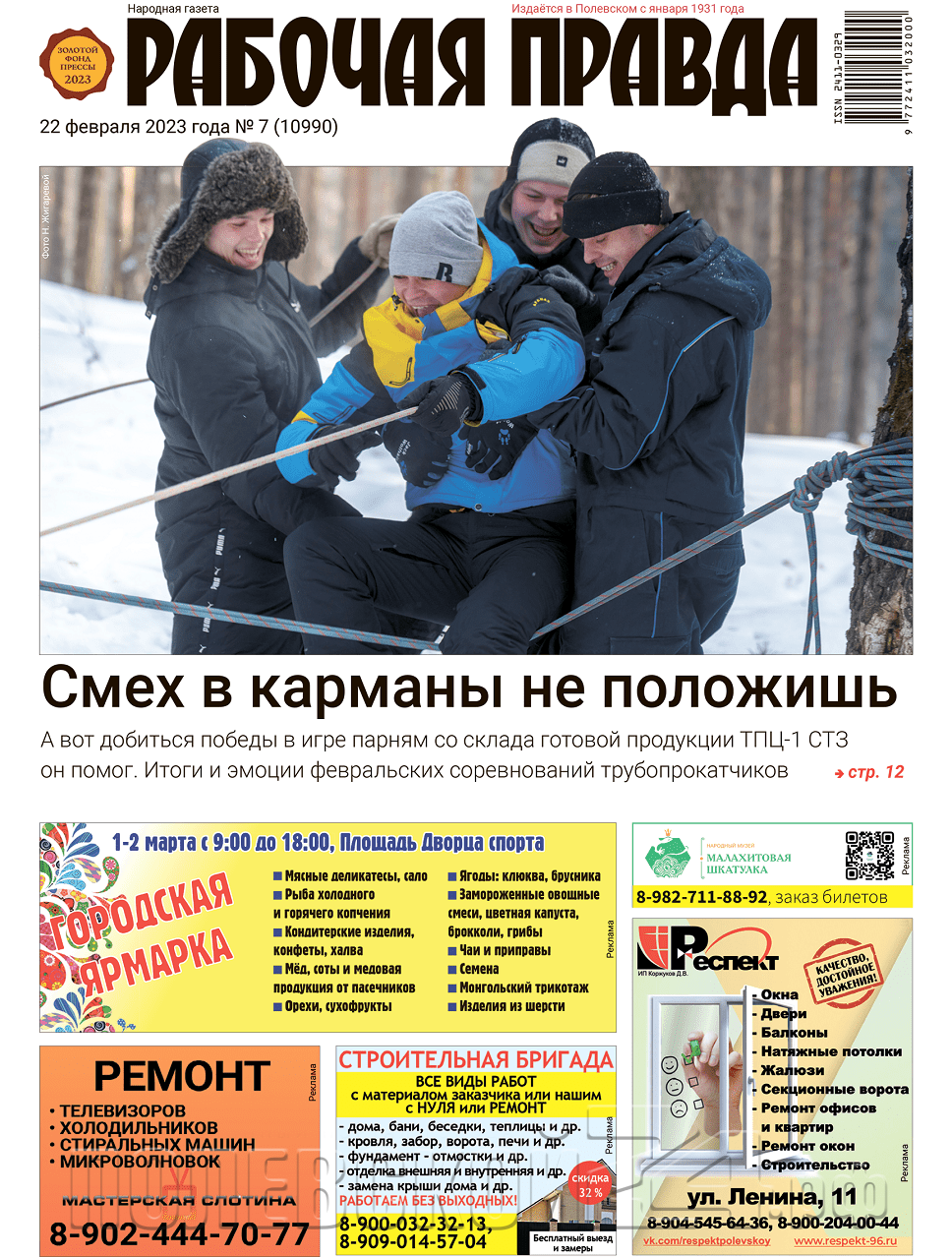 Среда пришла – рабочая неделя на убыль пошла, а неделя свежей прессы только началась. Первая полоса «Рабочей правды» призывает улыбаться и радоваться жизни. В субботу — в лес, не на работу! Трубопрокатчики СТЗ в одно субботнее утро поиграли в сантехников, дворников и строителей. Сразу с первой полосы переходите на 12, здесь итоги цеховой игры «Форт Боярд».