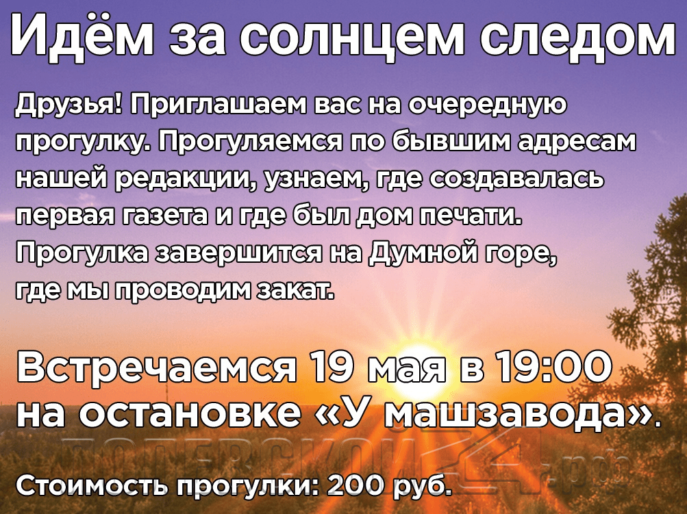 19 мая в 19:00 приглашаем прогуляться по бывшим адресам нашей редакции, расскажем, как создавалась первая газета, а потом пойдём на Думную гору провожать закат.
