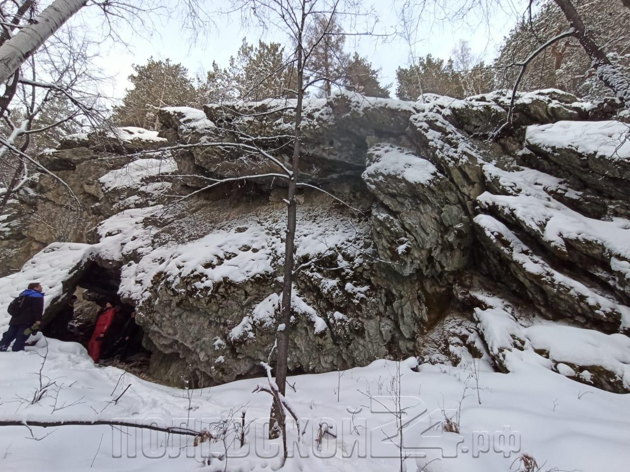 Немного поплутав по заснеженному лесу вдоль гряды скальных выходов, наша команда вышла к живописной пещере — Гроту Влюбленных.