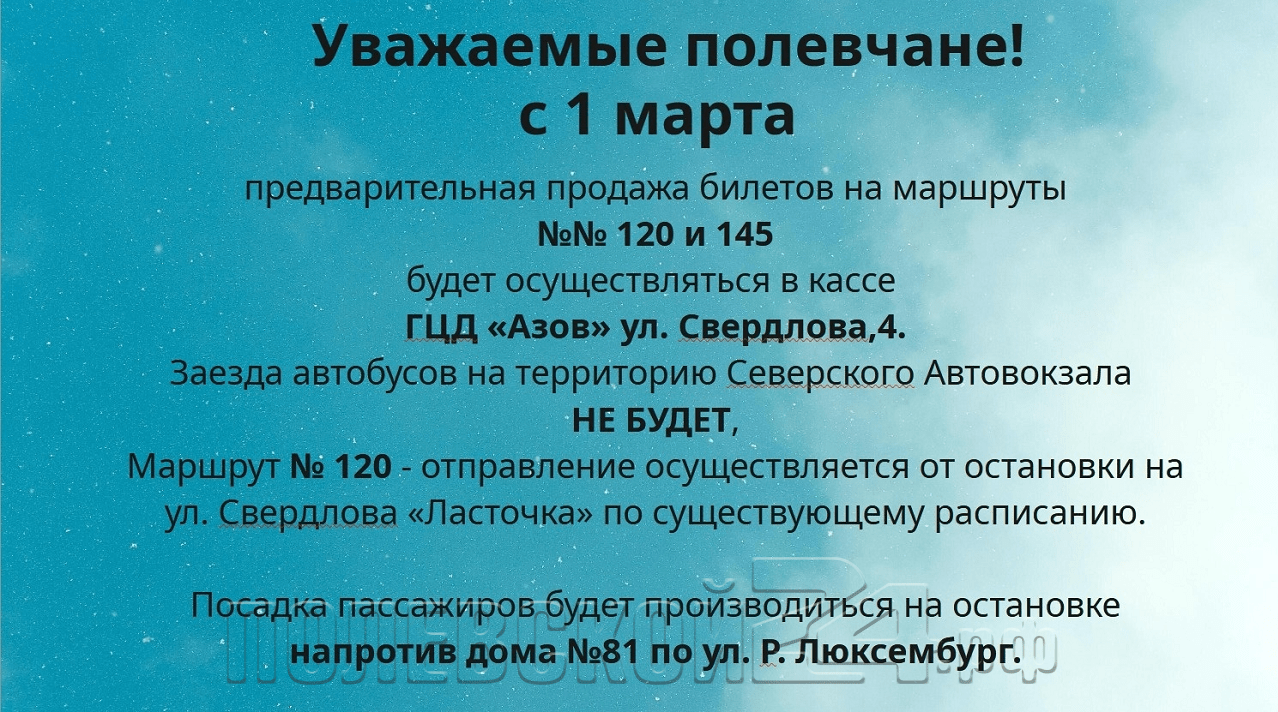Напомним, горожане призывают власти оставить автовокзал в работе — чтобы можно было купить билет в кассе и дождаться автобуса в относительном комфорте. Перевозчик же считает затраты на аренду перрона и кассы неоправданными, а само здание в качестве автовокзала слишком большим при имеющемся движении, и предлагает полевчанам уезжать в областной центр практически в режиме городского автобуса — что, в общем, ближе к понятию «пригородного транспорта».