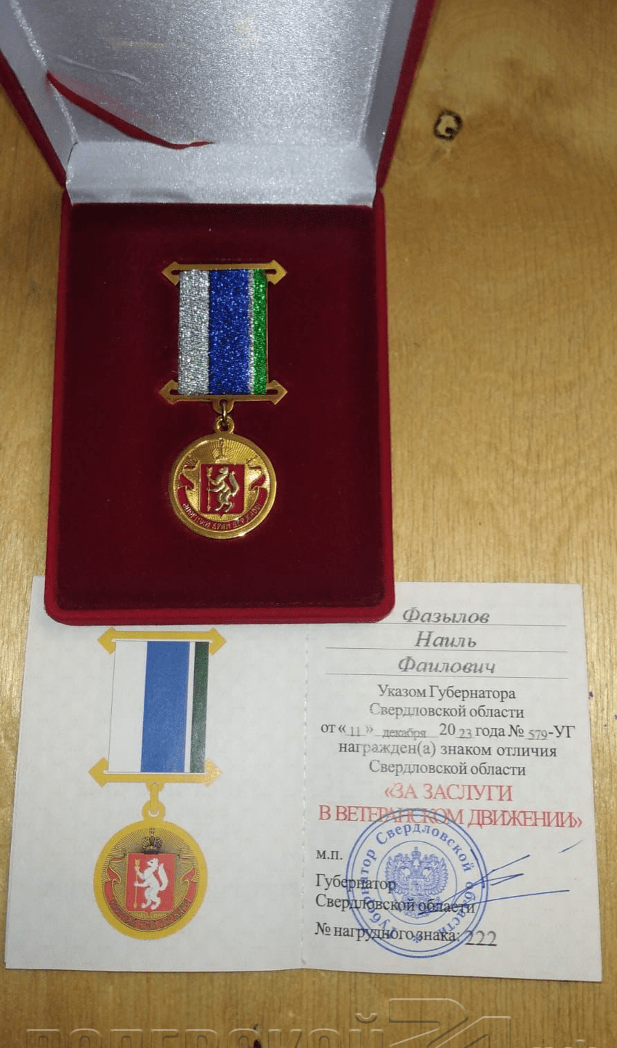 Указ губернатора области о награждении вышел еще в декабре. Но лишь на днях руководителю военно-патриотического клуба «Ратник», подполковнику запаса Наилю Фаиловичу Фазылову вручили областную награду — медаль «За заслуги в ветеранском движении».