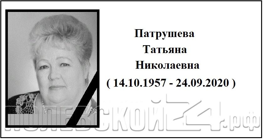 Прощание с Татьяной Николаевной Патрушевой состоится 26 сентября 2020 года (суббота) с 12.00 до 12.30 в ритуальном зале на Больничном переулке (территория ЦГБ).