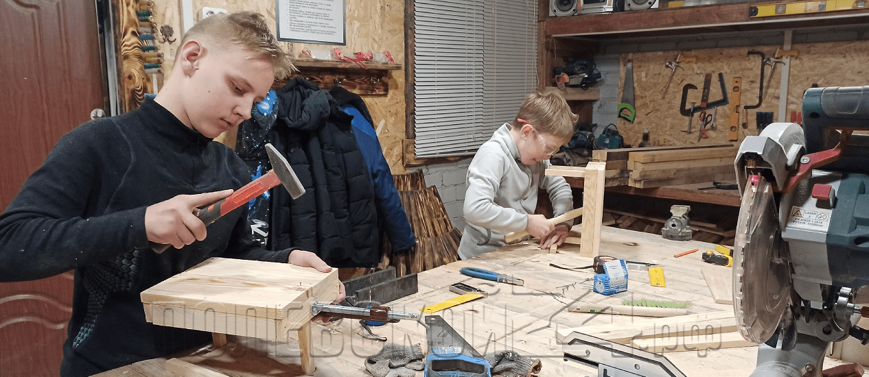 После новогодних каникул новое место притяжения юных мастеров и их родителей — столярная мастерская Военно-патриотического клуба «Бригада» — уже принимает первых желающих. Уже 9 января активист ВПК Александр Зимичев провел познавательное занятие для Димы Потеряева и Семена Бузина.