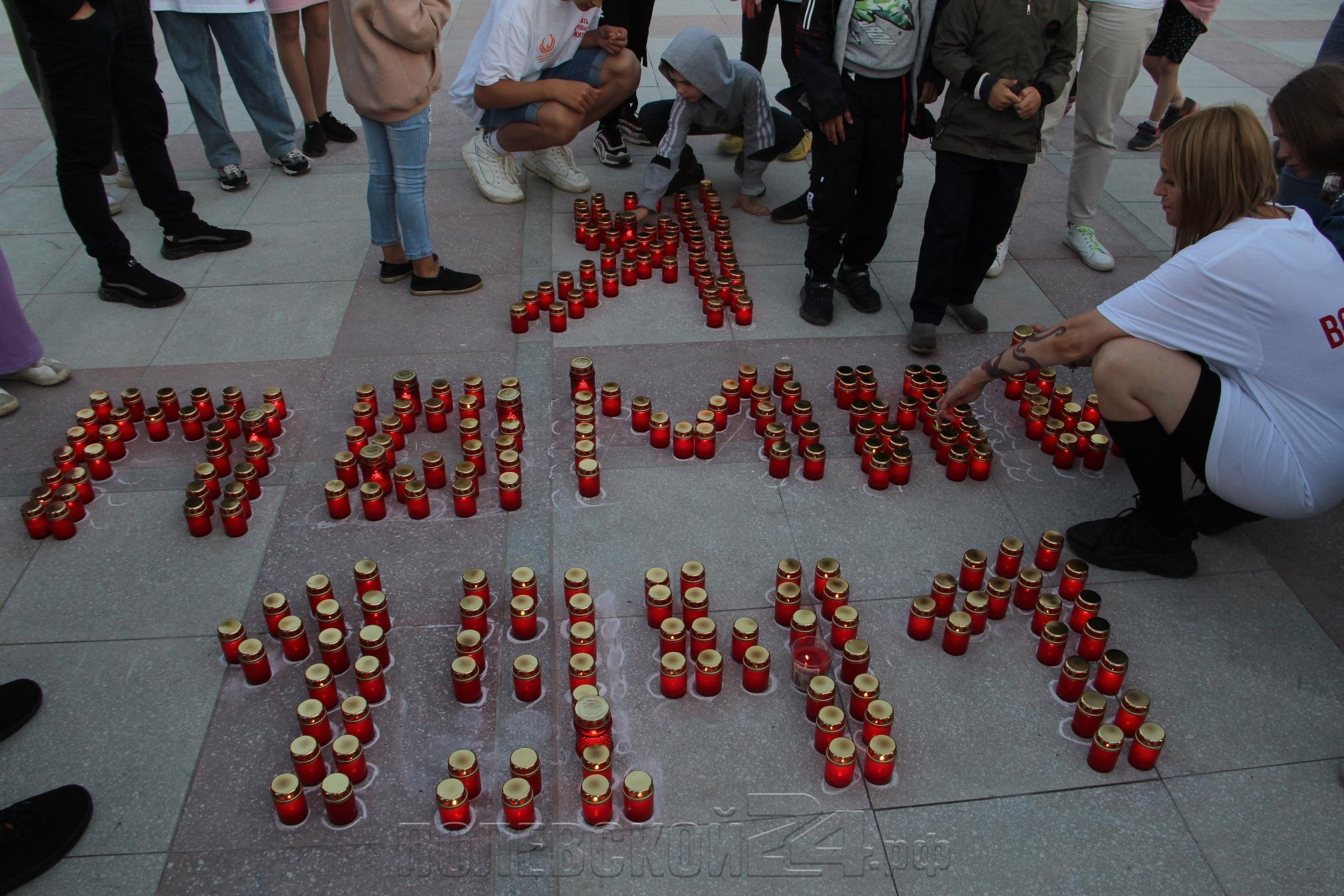 Здесь состоялась традиционная акция «Свеча памяти». Пришли десятки людей. Из свечек в банках они выстроили слова «Я помню» и дату 1945.