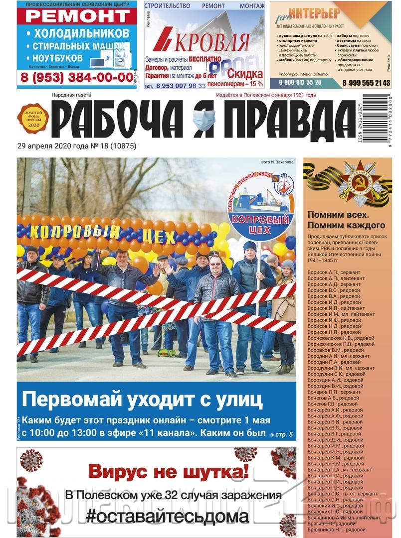 32 полевчанина заболели короновирусом. Поэтому в майские праздники сидим дома, читаем «Рабочую правду» и смотрим 11 канал. Берегите себя и ваших близких! (стр. 1)