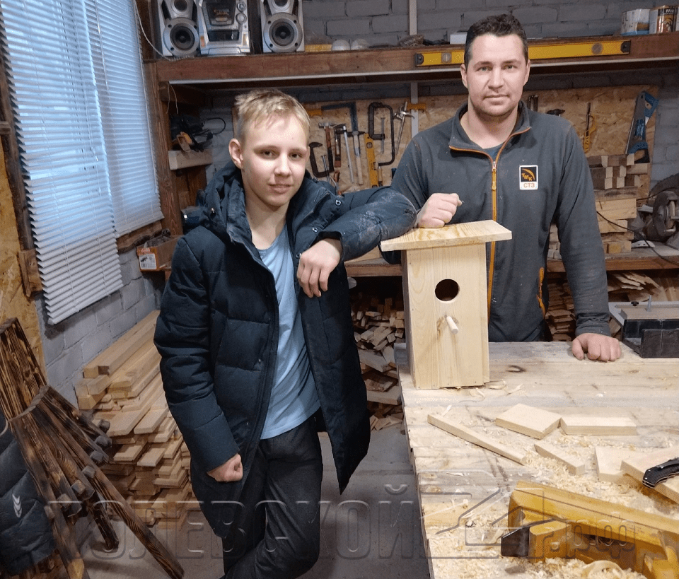 В столярной мастерской ВПК «Бригада» руками Дмитрия был сделан новый скворечник. С юным столяром работал активист ВПК «Бригада» Виталий Татаринцев .