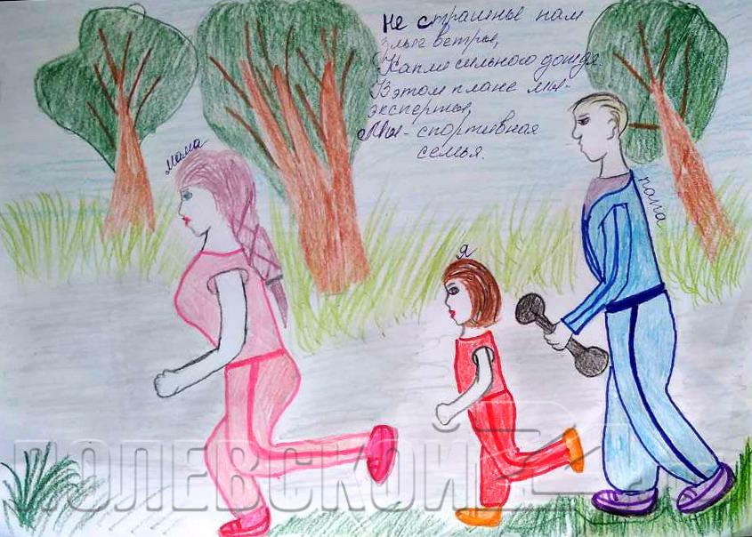 Среди участников конкурса были и полевчане более старшего возраста. В частности, пятнадцатилетний Алексей Белканов представил динамичный рисунок «Спорт это жизнь», а двенадцатилетняя Полина Немешаева изобразила спортивную семью во время занятий физкультурой.