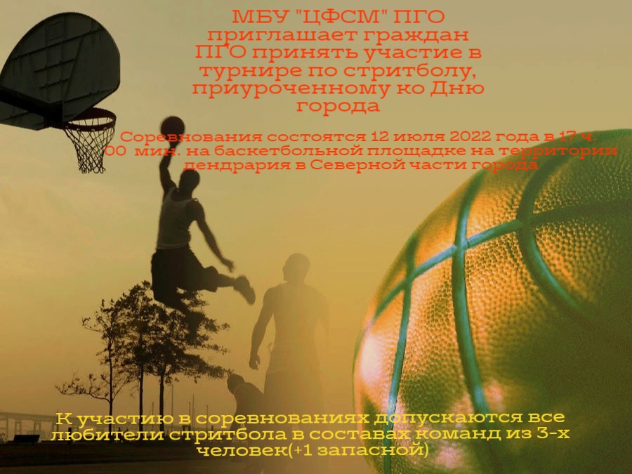 ЦФСМ ПГО приглашает всех желающих принять участие в турнире по стритболу, посвящённому Дню города, который состоится во вторник 12 июля в 17 ч. 00 мин. на территории парка-дендрария (угол Максима Горького и Степана Разина).