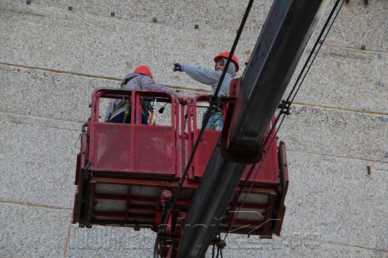 Сегодня Виталий и Василий (на стреле) проведут подготовительные работы, нанесут грунтовку. А на днях начнётся роспись. На этом этапе присоединится жена Виталия, соавтор мурала – Анна Черепанова. Полностью завершить работу на здании НИЦа планируют до 30 сентября.