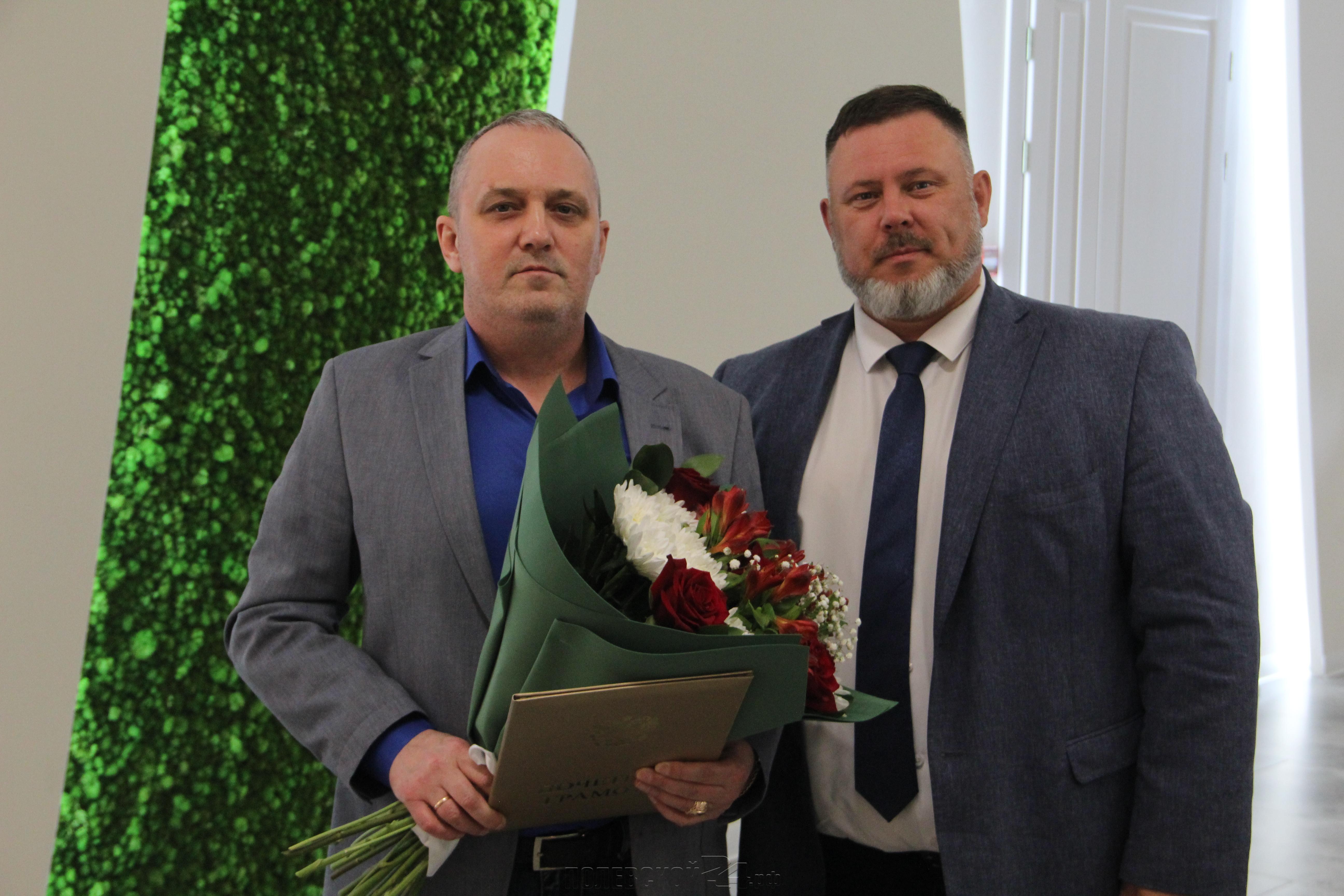 Исполняющий обязанности управляющего директора Роман Бушин вручил почетную грамоту федерального Минпромторга вальцовщику трубопрокатного цеха Сергею Топорову.