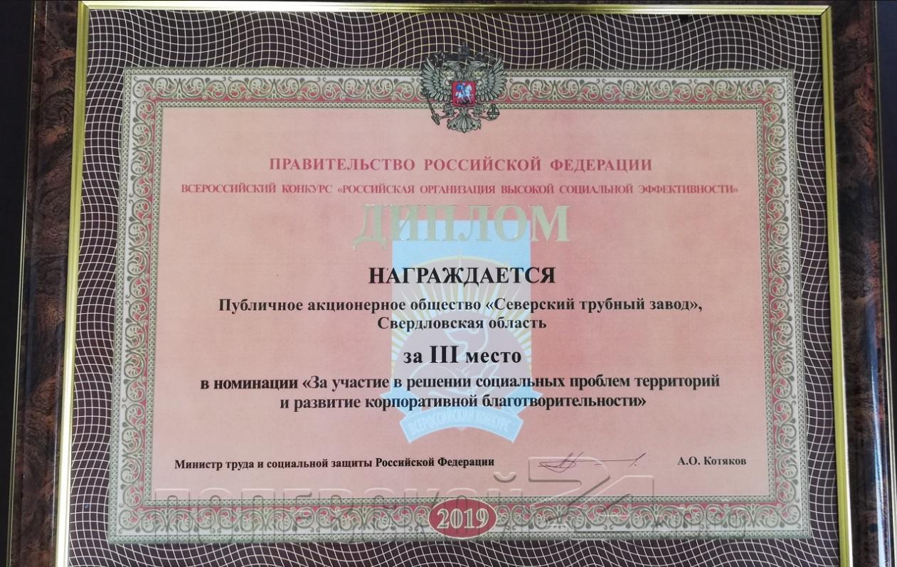 Акционерное общество «Северский трубный завод» признано призером Всероссийского конкурса и награждено дипломом Правительства РФ за III место в номинации «За участие в решении социальных проблем территорий и развитие корпоративной благотворительности».